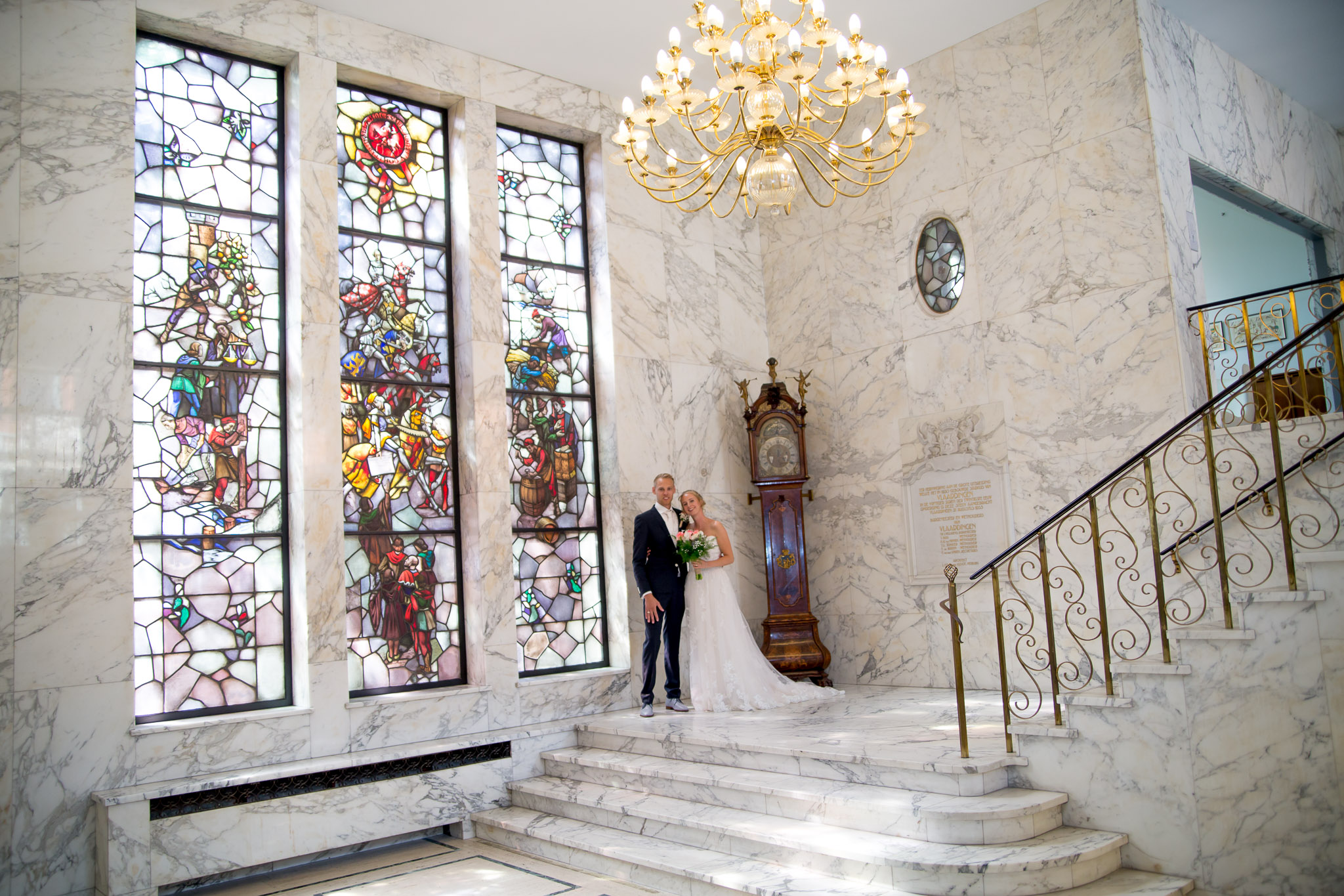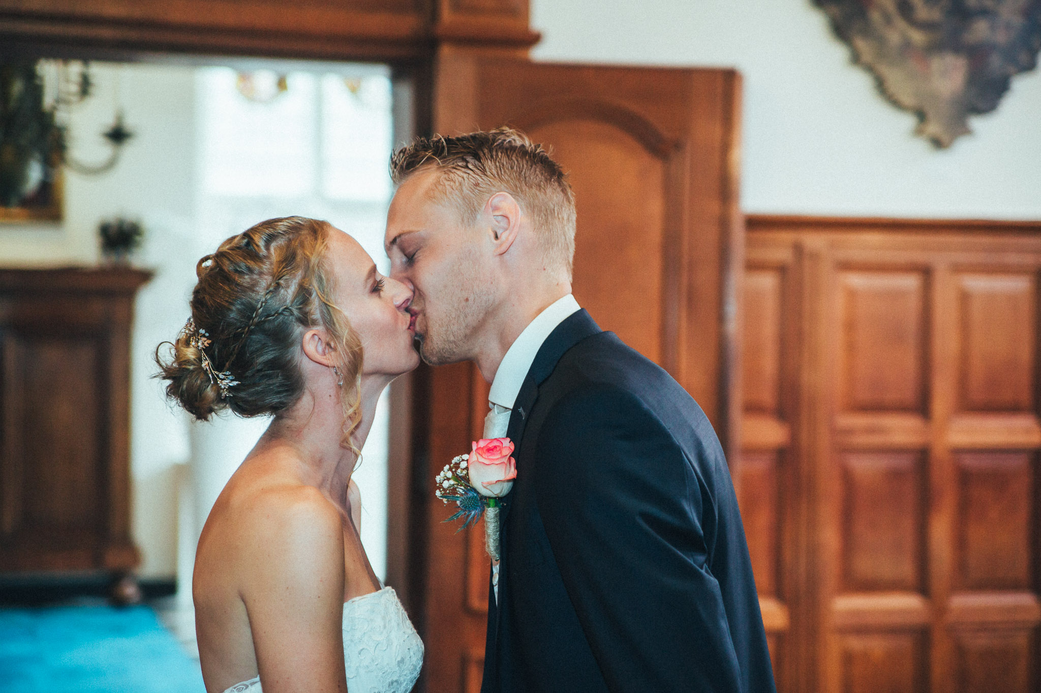 Om 12.00 uur startte de bruiloft ceremonie in het stadhuis. Bij aankomst stonden bijna al onze vrienden en familie al klaar op het plein, wat fantastisch! Mijn vader bracht mij naar het altaar en daar stond Jeroen klaar, vol trots, te wachten op zijn aanstaande vrouw. Een hele leuke, persoonlijke speech vol humor volgde van de trouwambtenaar. Als ik de foto’s terugkijk van dat moment, zie ik eigenlijk 2 verliefde puppy’s op het bankje klaar zitten! Zo lief!